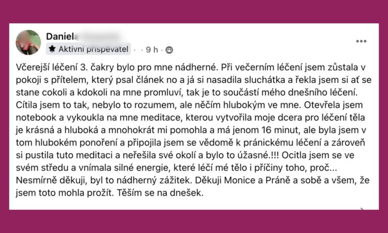 Podívejte se na sdílení účastníků pránického léčení v naší FB skupině, ve které je už přes 4000 členů! Naladěný prostor pro otevřená sdílení, vzájemnou podporu i inspiraci.
