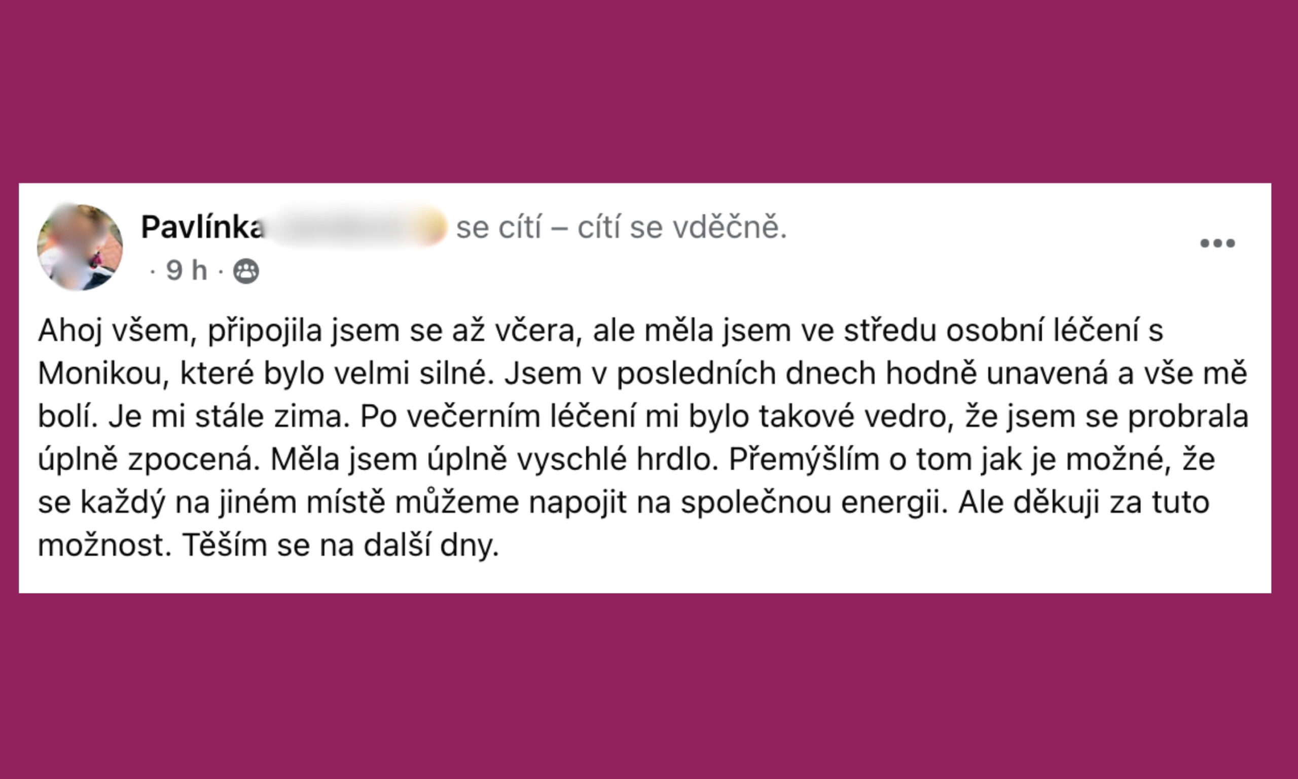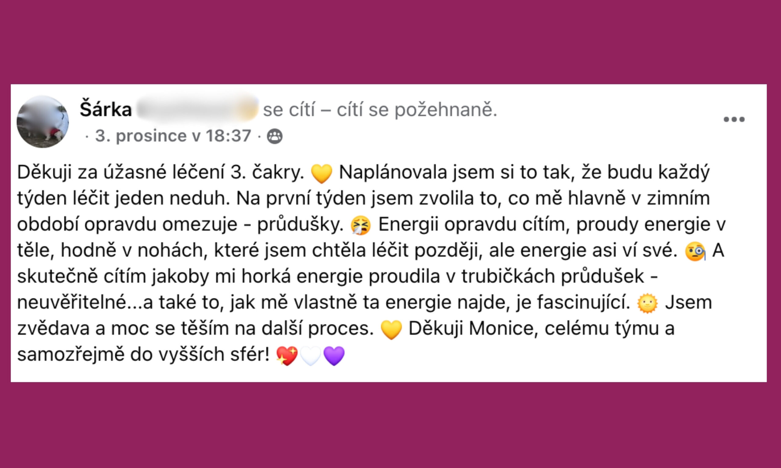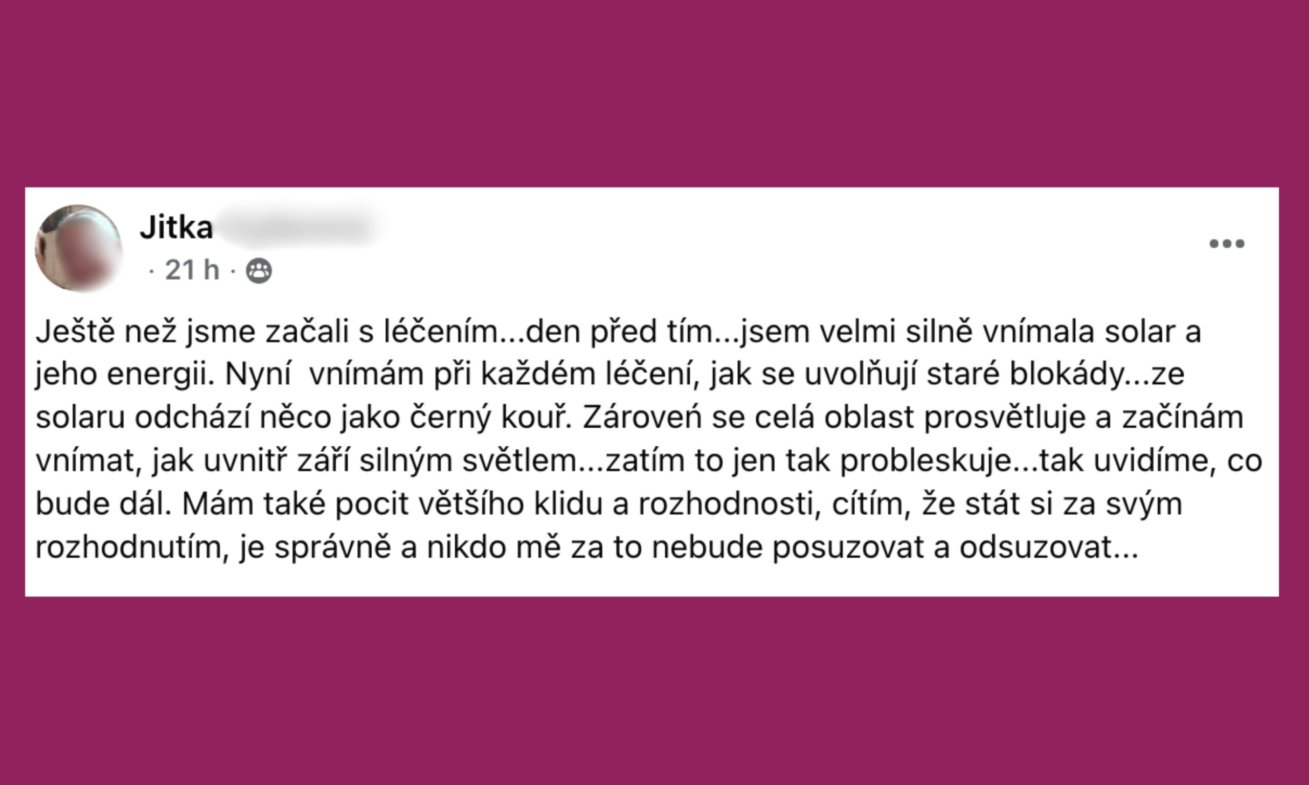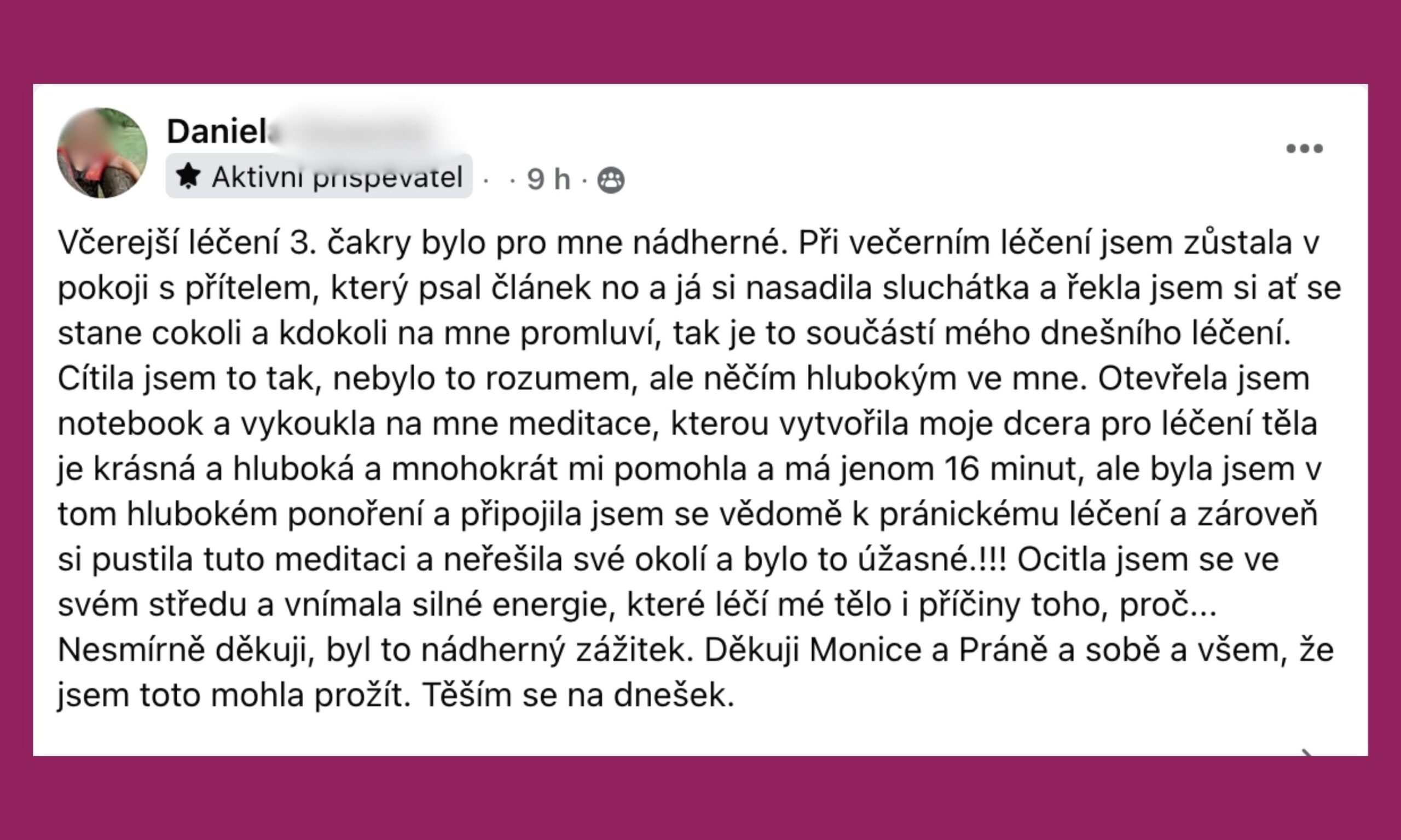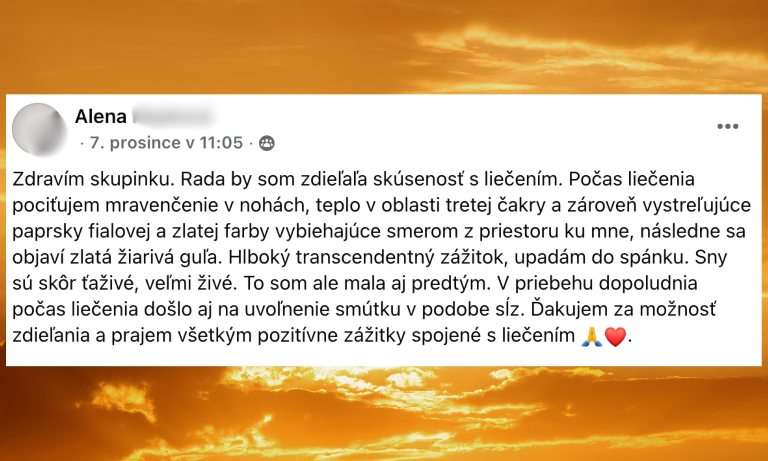 Podívejte se na sdílení účastníků pránického léčení v naší FB skupině, ve které je už přes 4000 členů! Naladěný prostor pro otevřená sdílení, vzájemnou podporu i inspiraci.